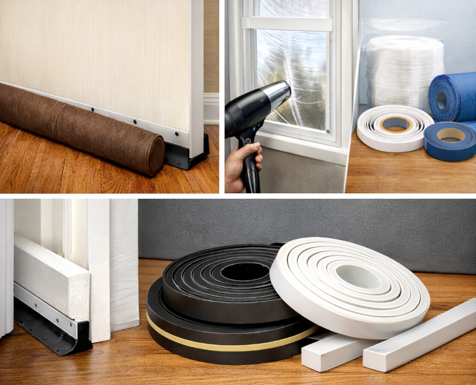 Rebates available for door draft stoppers, window insulation kits, and weatherstripping.